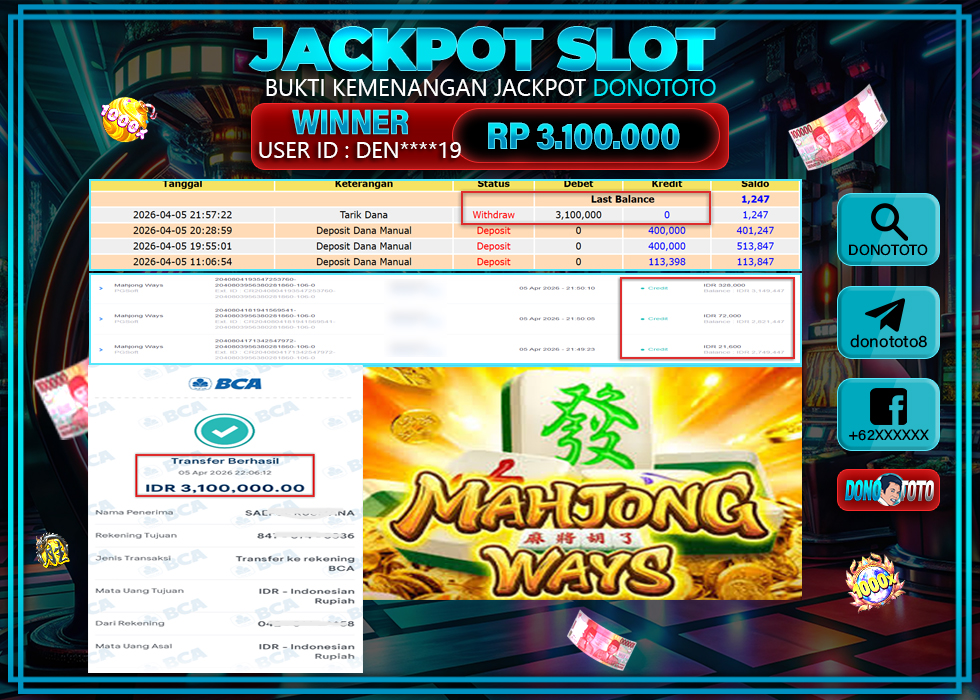 Bukti Jackpot Slot Online DONOTOTO Minggu 5 April 2026 – DONOTOTO adalah bo togel online terpercaya. Berikut ini kami berikan info bukti jackpot member DONOTOTO yang sudah kami bayar lunas dalam permainan slot online.