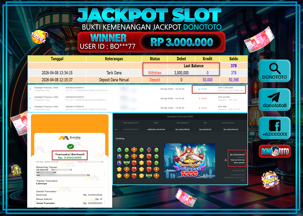 Bukti Jackpot Slot Online DONOTOTO Rabu 8 April 2026 – DONOTOTO adalah bo togel online terpercaya. Berikut ini kami berikan info bukti jackpot member DONOTOTO yang sudah kami bayar lunas dalam permainan slot online.