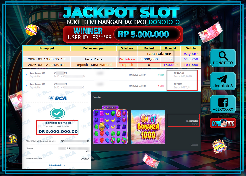 Bukti Jackpot DONOTOTO Slot Online Jum'at 13 Maret 2026 5.000.000 - LUNAS