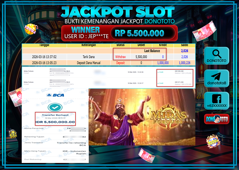 Bukti Jackpot DONOTOTO Slot Online Senin 16 Maret 2026 5.500.000 - LUNAS