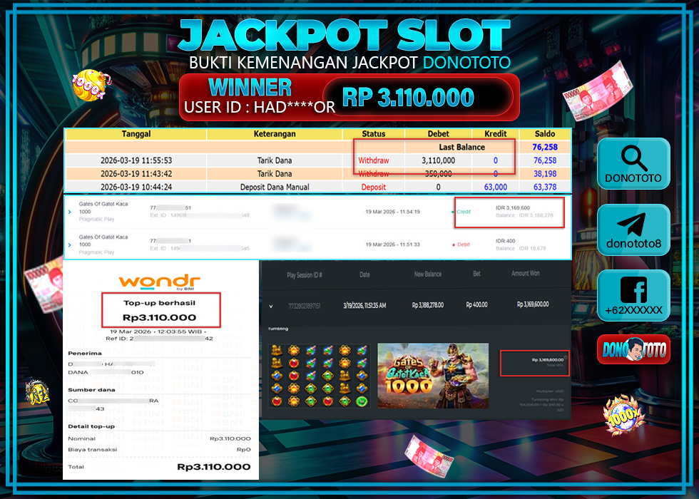 Bukti Jackpot DONOTOTO Slot Online Kamis 19 Maret 2026 3.110.000 - LUNAS