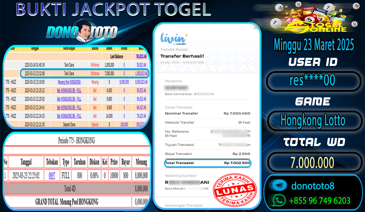 Bukti Jackpot DONOTOTO Togel Online Minggu 23 Maret 2025 7.000.000 - LUNAS