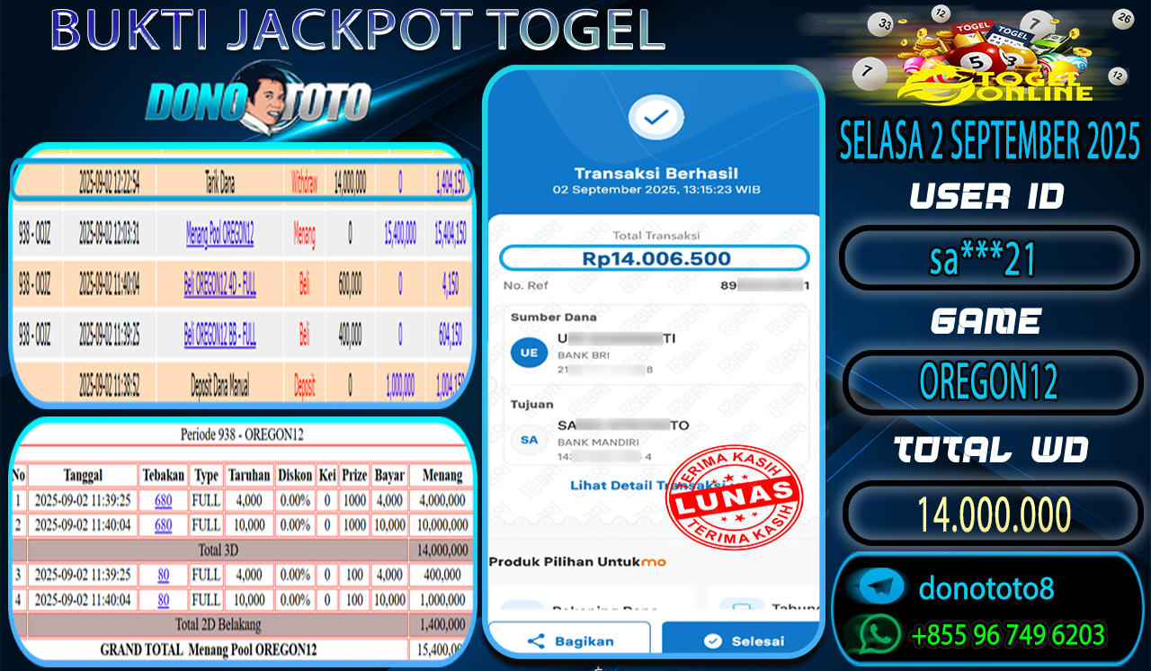 Bukti Jackpot DONOTOTO Togel Online Selasa 2 September 2025 14.000.000 - LUNAS