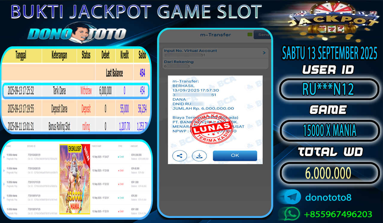 Bukti Jackpot DONOTOTO Slot Online Sabtu 13 September 2025 6.000.000 - LUNAS