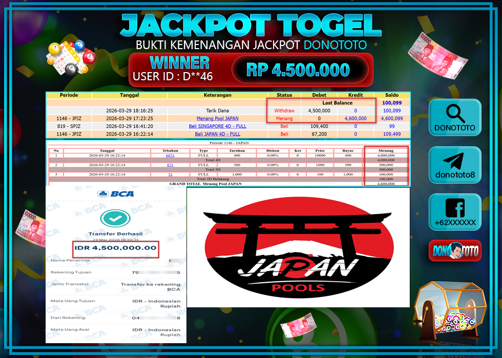 Bukti Jackpot DONOTOTO Togel Online Minggu 29 Maret 2026 4.500.000 - LUNAS