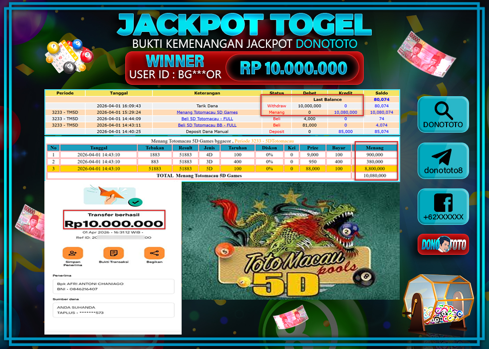 Bukti Jackpot DONOTOTO Togel Online Rabu 1 April 2026 10.000.000 - LUNAS