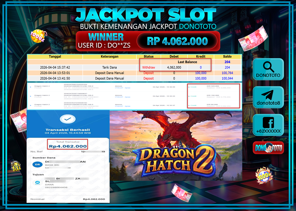 Bukti Jackpot DONOTOTO Slot Online Sabtu 4 April 2026 4.062.000 - LUNAS
