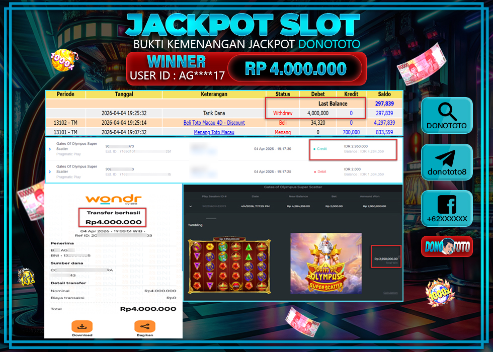 Bukti Jackpot DONOTOTO Slot Online Sabtu 4 April 2026 4.000.000 - LUNAS