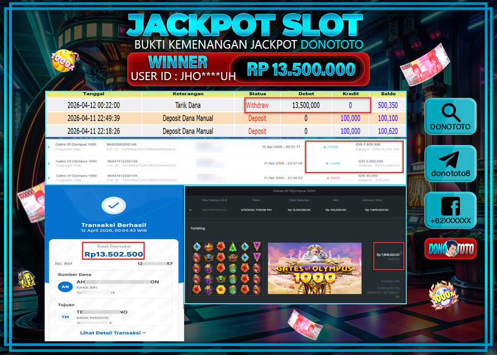 Bukti Jackpot Slot Online DONOTOTO Minggu 12 April 2026 – DONOTOTO adalah bo togel online terpercaya. Berikut ini kami berikan info bukti jackpot member DONOTOTO yang sudah kami bayar lunas dalam permainan slot online.