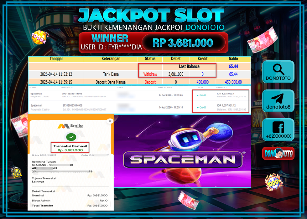 Bukti Jackpot DONOTOTO Slot Online Selasa 14 April 2026 3.681.000 - LUNAS