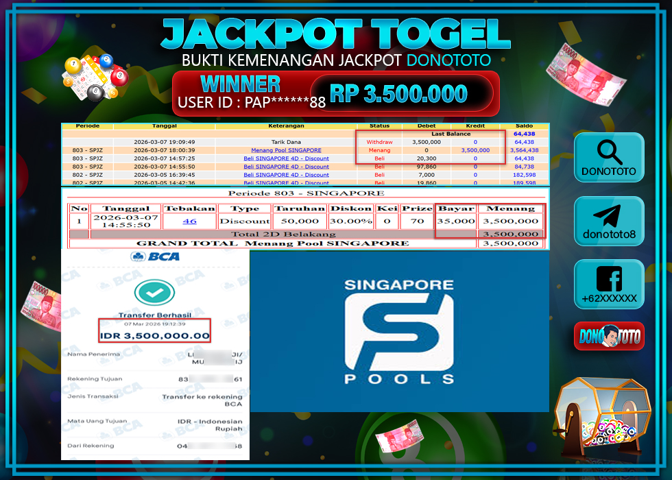 Bukti Jackpot DONOTOTO Togel Online Sabtu 7 Maret 2026 3.500.000 - LUNAS