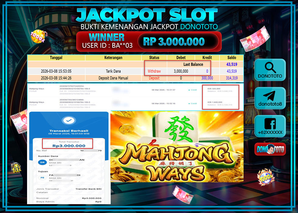 Bukti Jackpot DONOTOTO Slot Online Minggu 8 Maret 2026 3.000.000 - LUNAS