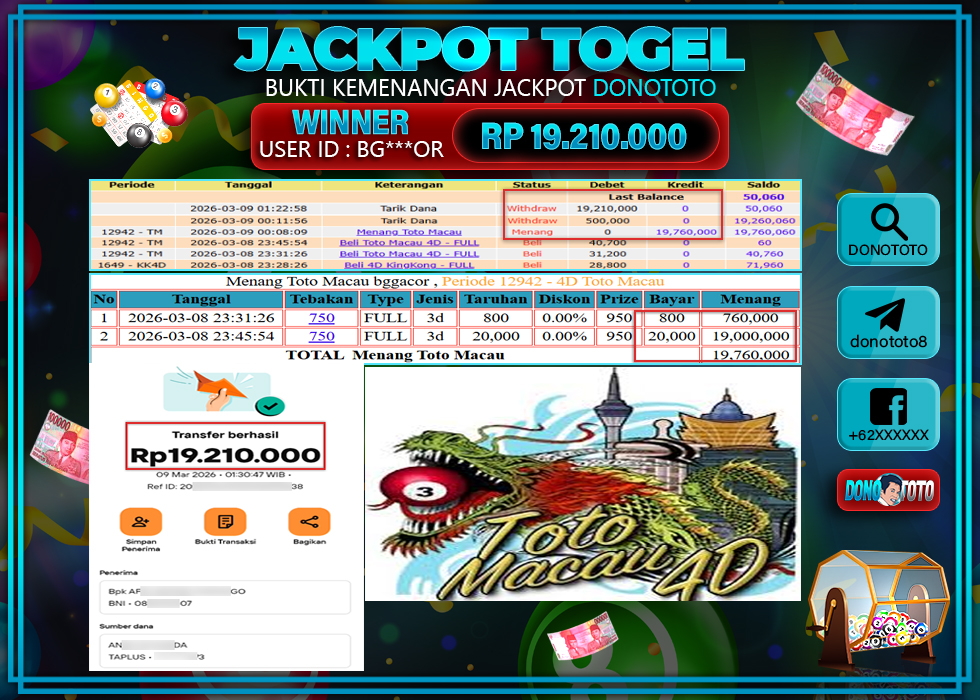 Bukti Jackpot DONOTOTO Togel Online Senin 9 Maret 2026 19.210.000 - LUNAS