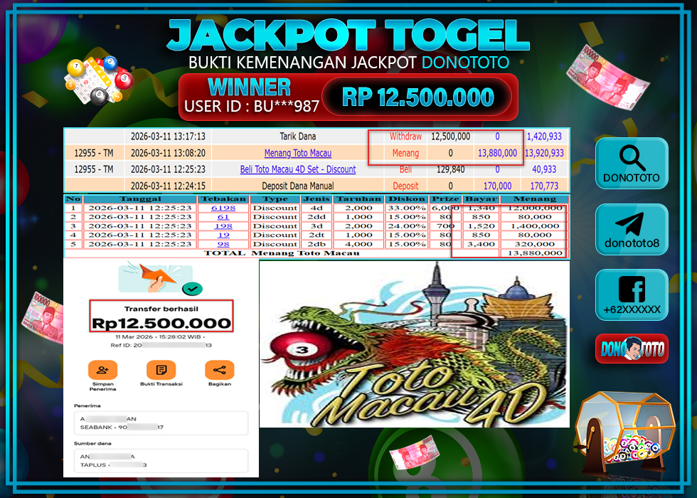 Bukti Jackpot DONOTOTO Togel Online Rabu 11 Maret 2026 12.500.000 - LUNAS
