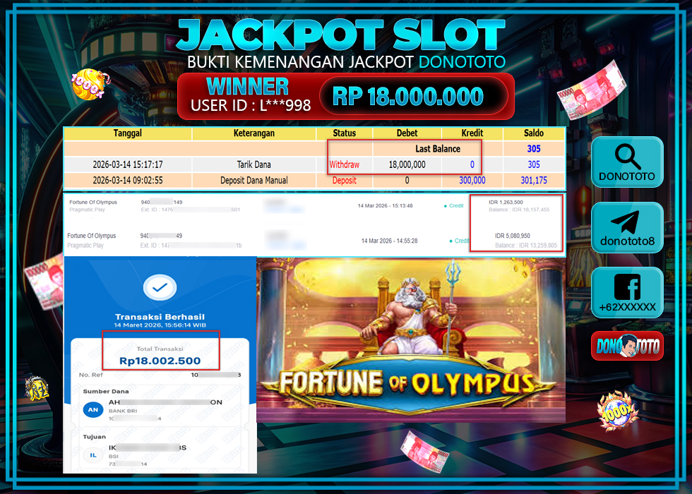 Bukti Jackpot DONOTOTO Slot Online Sabtu 14 Maret 2026 18.000.000 - LUNAS