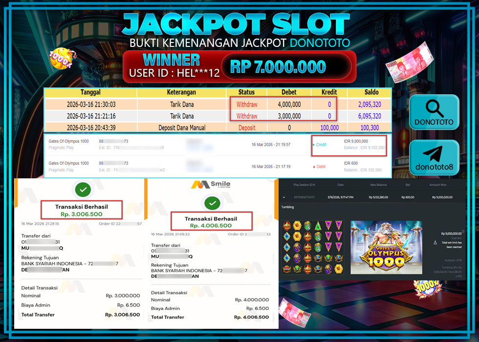 Bukti Jackpot DONOTOTO Slot Online Senin 16 Maret 2026 7.000.000 - LUNAS
