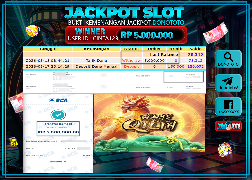 Bukti Jackpot DONOTOTO Slot Online Rabu 18 Maret 2026 5.000.000 - LUNAS