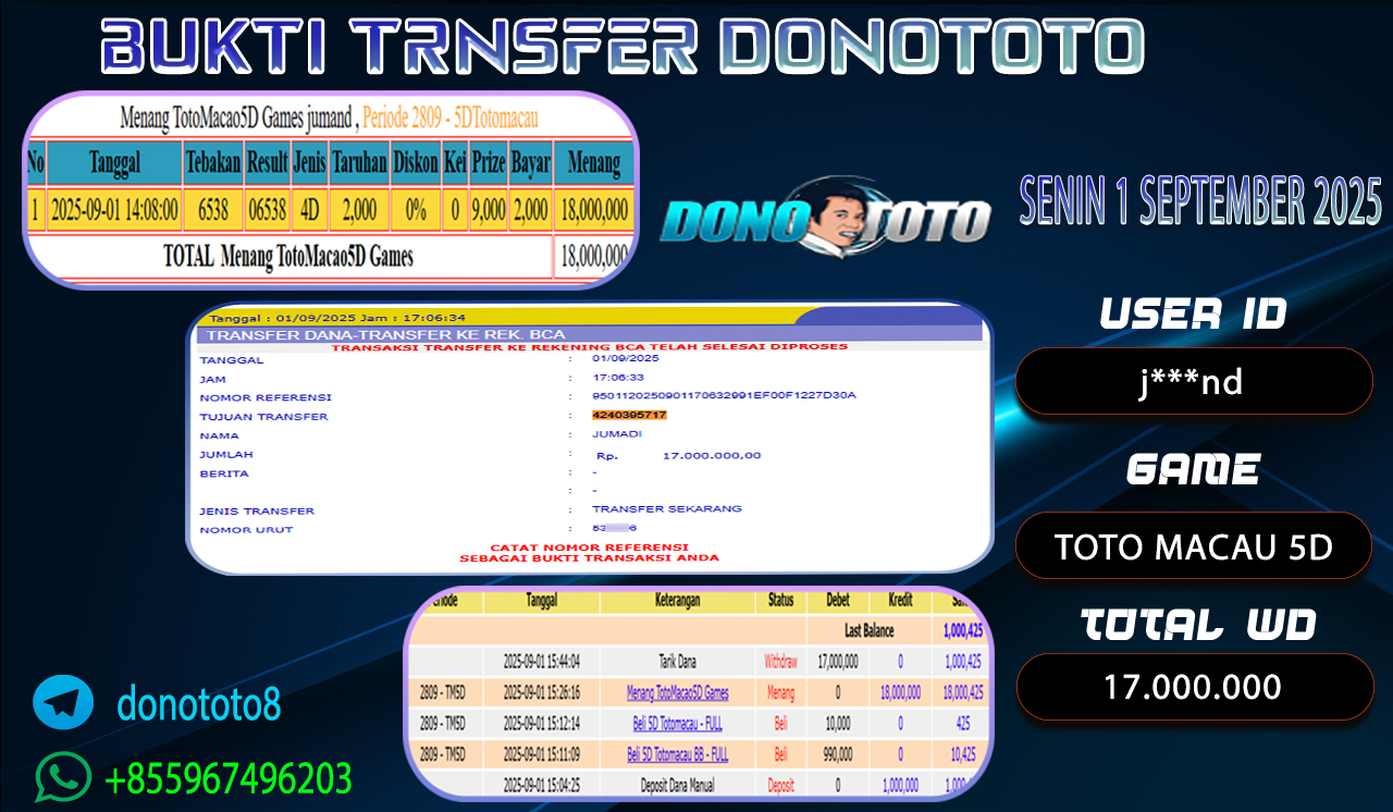 Bukti Jackpot DONOTOTO Togel Online Senin 1 September 2025 17.000.000 - LUNAS