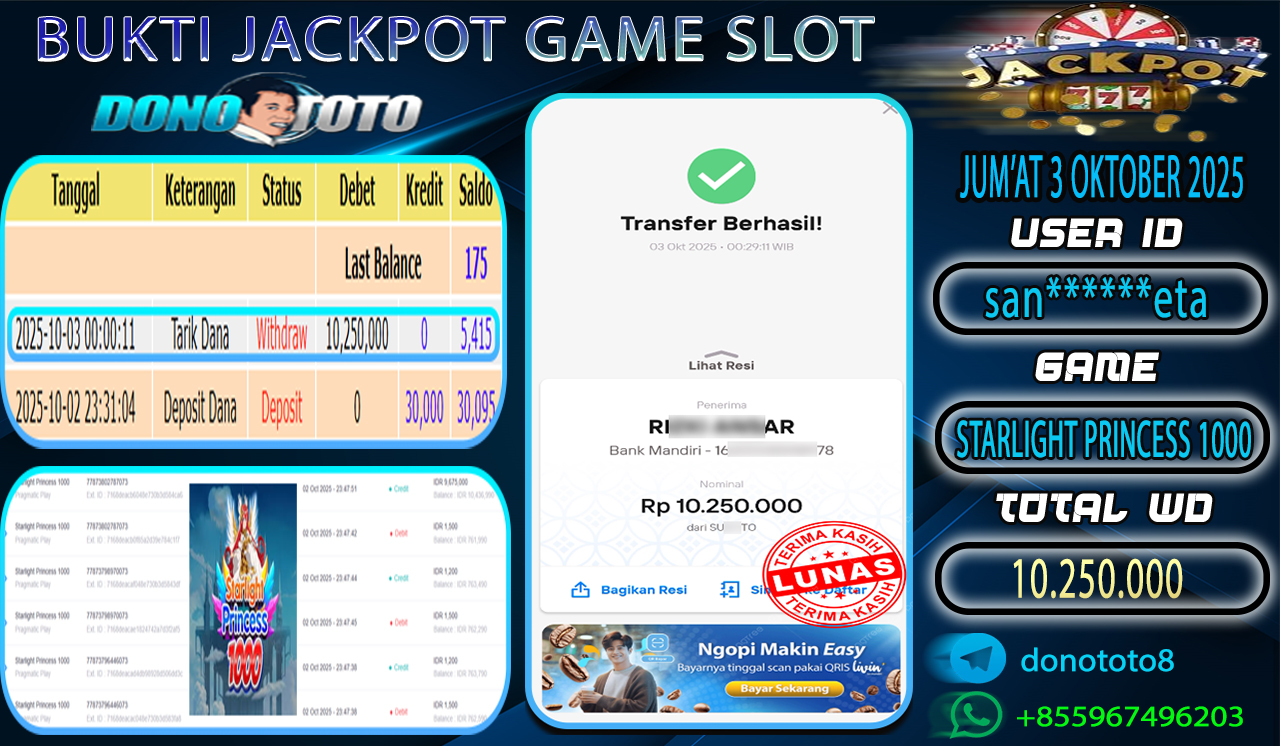 Bukti Jackpot DONOTOTO Slot Online Jum'at 3 Oktober 2025 10.250.000 - LUNAS