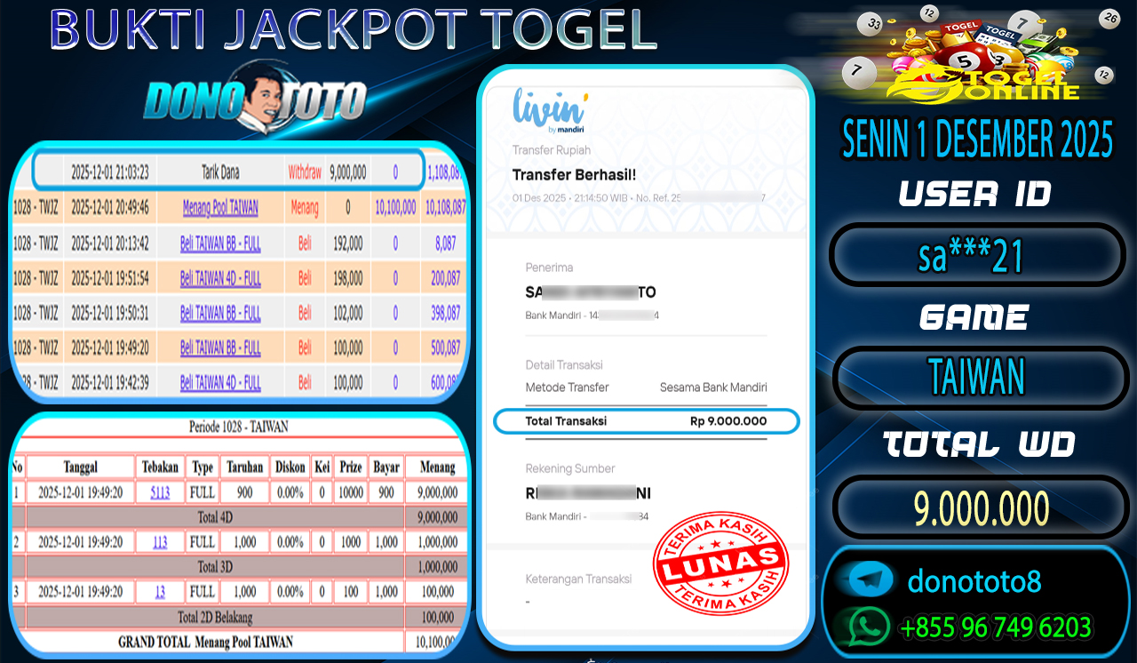Bukti Jackpot DONOTOTO Togel Online Senin 1 Desember 2025 9.000.000 - LUNAS