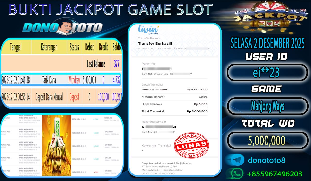 Bukti Jackpot DONOTOTO Slot Online Selasa 2 Desember 2025 5.000.000 - LUNAS